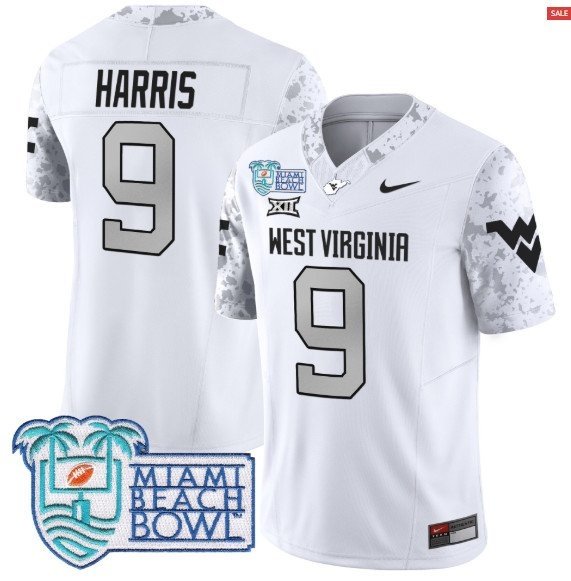 Major Harris #9 West Virginia Mountaineers 2025 Miami Beach Bowl Vapor White