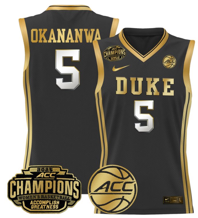 Women’s Oluchi Okananwa Jersey #5 Duke Blue Devils 2025 ACC Champions Black Gold